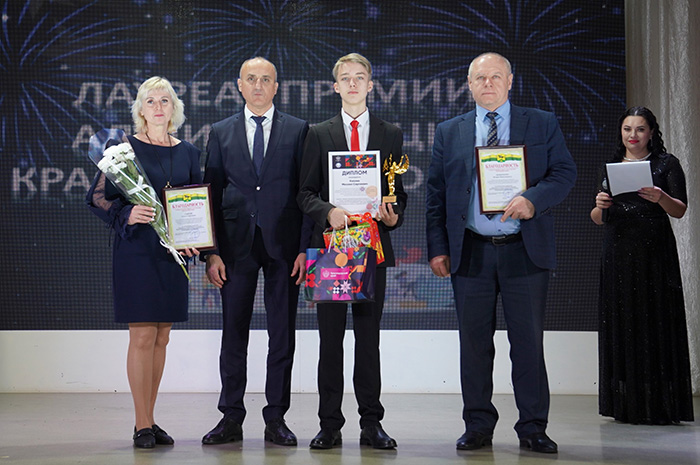 - Первым на сцену поднялся Михаил Каплин - лауреат премии администрации Краснодарского края. К слову, региональную награду девятиклассник гимназии городской гимназии № 8 получил второй год подряд. А ещё Михаил - пятикратный обладатель премии «Одаренные дети»! И это неудивительно, ведь юноша - победитель регионального этапа всероссийской олимпиады школьников по искусству, всероссийских конкурсов «Будущие Ломоносовы» и «Созидание и творчество», призер регионального этапа ВсОШ по основам безопасности и защиты Родины, а также победитель и призёр Всероссийского конкурса «Интеллектуально-творческий потенциал России».