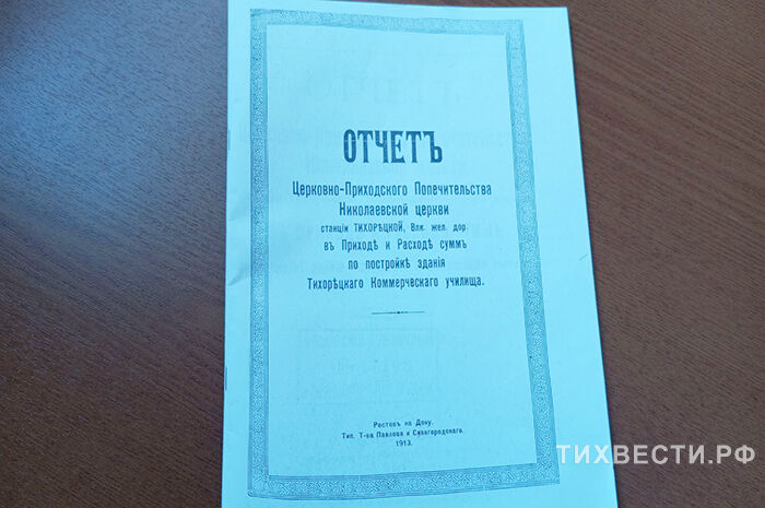 У меня есть для школы небольшой подарок. В июне прошлого года тот самый Саша Мартынов нашёл в архивах Москвы документ, касающийся нашей школы. Это Отчёт церковно-приходского попечительства Николаевской церкви станции Тихорецкая 1913 года по постройке здания Тихорецкого коммерческого училища, копию которого я передам в школьный музей. Здесь указано, что здание восьмиклассного училища строилось в две очереди, закладка первой части сделана 14 мая 1909 года, а 3 октября 1910 года - по новому стилю 17 октября - состоялось освящение и торжественное открытие построенной части здания. Вот откуда 115-летие школы!