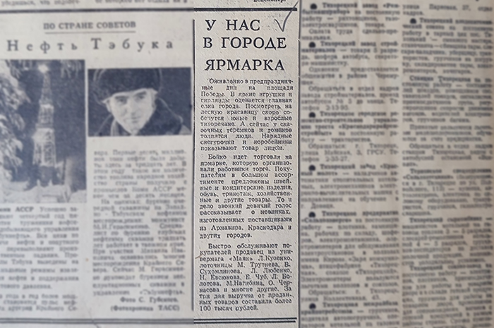 А на следующий день корреспондент делится впечатлениями из самого центра города: «Оживлённо в предпраздничные дни на площади Победы. В яркие игрушки, гирлянды одевается главная ёлка города. …У сказочных теремков и домиков толпятся люди. Нарядные Снегурочки и коробейники показывают товар лицом. Покупателям в большом ассортименте предложены швейные, кондитерские изделия, обувь, трикотаж, хозяйственные и другие товары».
