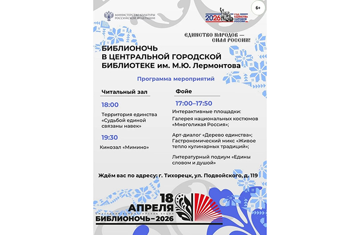 «Библионочь-2026» пройдет в Тихорецком районе 18 апреля. Библиотеки города присоединились к всероссийской акции и приглашают земляков. Одну из самых масштабных программ приготовила модельная библиотека "Глагол".