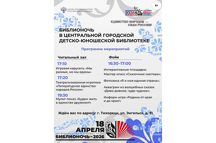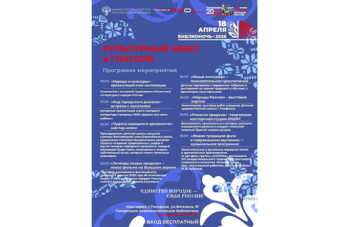 - Наша программа объединит традиции, творчество и современное искусство. Приходите всей семьей, будет интересно каждому! - приглашают библиотекари. - Ждём жителей и гостей Тихорецка по адресу: Тихорецк, ул. Энгельса, 91, вход свободный.